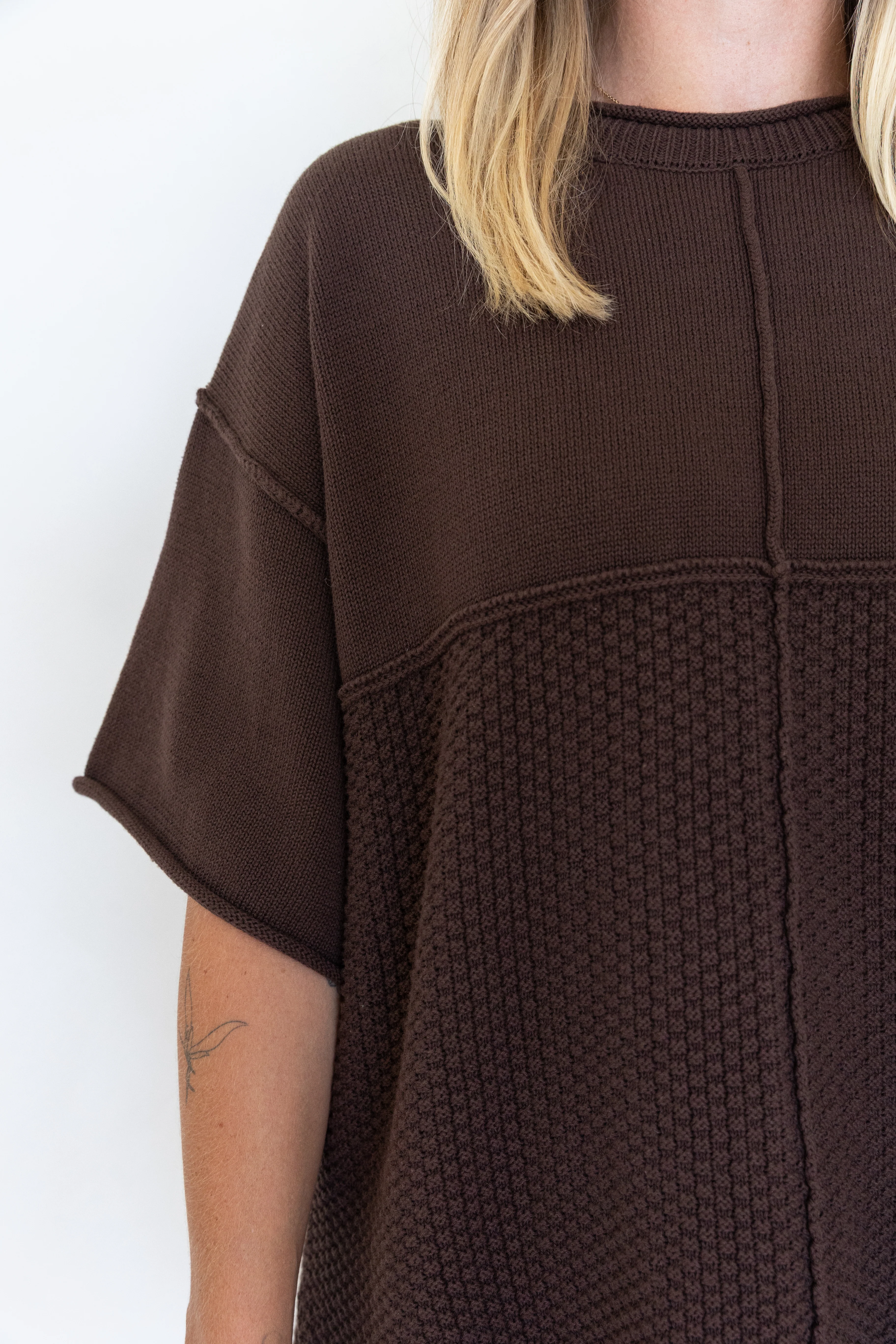 The Hinterland Knit Top is an easy, relaxed piece designed for effortless everyday wear. Knitted in a rich chocolate waffle stitch with spliced panelling and exposed seams. With a loose fit and short sleeves, itās the perfect throw-on style for relaxed days, whether paired with the matching shorts or worn with your favourite bottoms.
