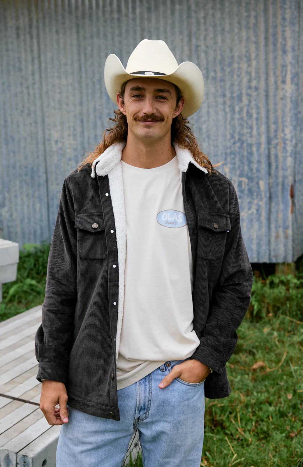The West of Nowhere Cord Jacket is your new go-to for cool country mornings. Crafted from charcoal corduroy with a soft white fleece lining, itās equal parts rugged and cosy. Made to throw on and go - whether youāre chasing the sunrise or heading into town.